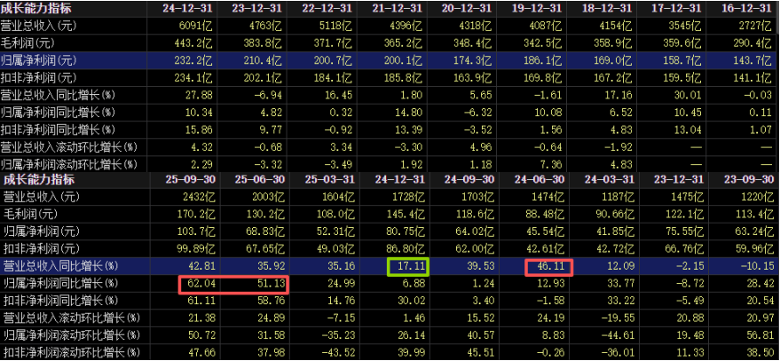 营收增长:营收从 2023 年的4763亿元增长至 2024年的6091亿元,2025年业绩预告显示。净利润从 2023年的210亿增长至 2025年的351亿—357亿元。