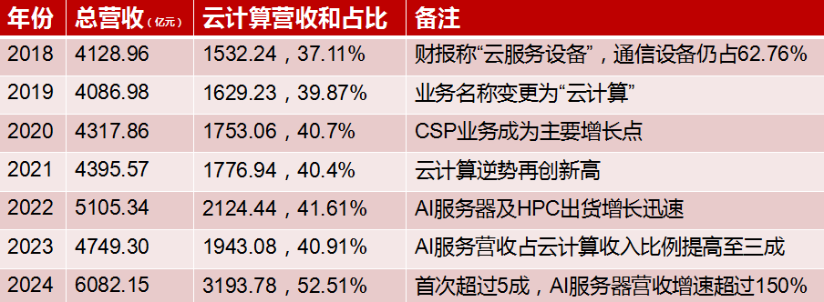 云计算占比从2018年上市时的37.11%上升至2025年的超过50%,成为第一大营收支柱,而AI服务器营收则同比增速超过150%,占云计算比例超过40%。如下: