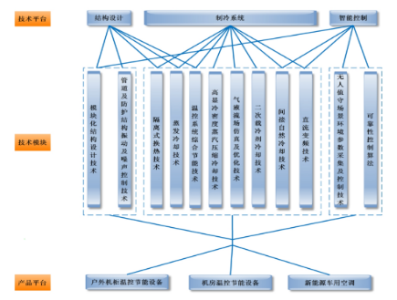 公司采取平台化研发模式,建立智能控制系统设计、散热及环境控制系统设计、机电一体化架构系统设计等三大研发共用基础技术模块( CBB 平台,依靠不同技术平台演进,不断开发出自然冷却技术、直流变频技术、制冷系统设计及仿真技术、温湿度解耦控制算法、制冷及环境多变量控制算法、软硬件及智能控制系统设计技术、结构及气流组织设计技术等核心技术,通过各核心技术的有机搭配、组合,形成户外机柜温控节能设备、机房温控节能设备 、新能源车用空调三大产品线,进而服务于最终客户。
